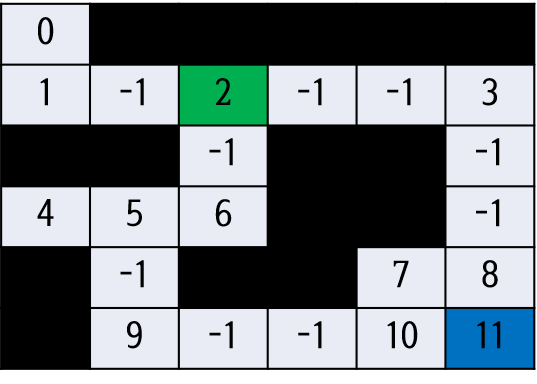 -1은 노드가 있는 셀을 의미하고, 그 이외의 숫자가 적힌 셀은 노드라는 것을 의미합니다.